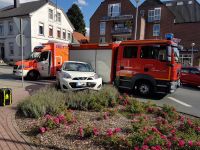 Auf der Anfahrt zur Einsatzstelle kam es zu einem Verkehrsunfall zwischen dem erstausrückenden Feuerwehrfahrzeug und einem PKW. Dabei wurden beide Fahrzeuge beschädigt. Personen kamen nicht zu Schaden. Vorsichtshalber wurde jedoch ein Rettungswagen zur Unfallstelle beordert.