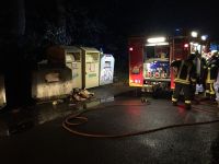 Es brannte in einem mit Papier gefülltem Container. Dieser wurde auf die Seite gekippt und der Brandherd von einer Person unter schwerem Atemschutz gelöscht. Die nebenstehenden Container wurden ebenfalls kontrolliert, dies ergab jedoch keine weitere Feststellung. Der Container wurde wieder aufgerichtet und an die Seite geschoben. Einsatzende.