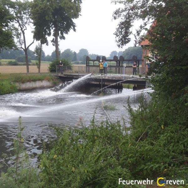 Im aufgestauten Bereich der Aa an der Aldruper Straße rangen viele Fische an der Wasseroberfläche um Luft, einzelne Fische waren bereits verendet. Zur Erhöhung des Sauerstoffanteils wurde das Wasser mit mehreren Pumpen umgewälzt. Die Maßnahme zeigte Wirkung, nach einiger Zeit konnten die meisten Fische wieder abtauchen.